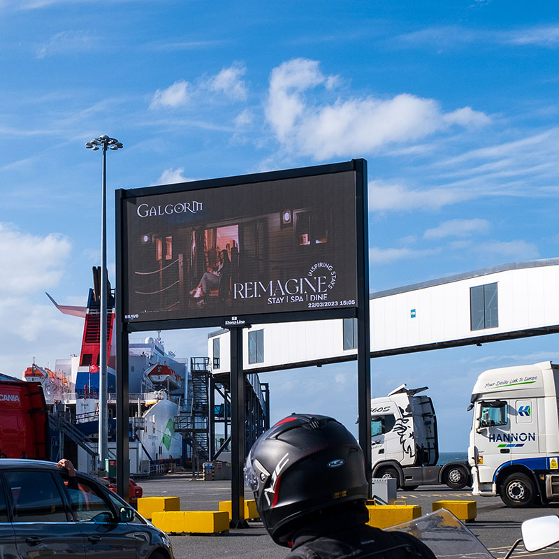 At the Cairnryan terminal, advertising opportunities begin well before passengers set foot on the ferry. Dominating the terminal's exterior is an unmissable 6m x 3m LED screen (1920px by 1080px), strategically positioned to capture the attention of everyone arriving at or passing by the port. Its full HD resolution and scale ensure that campaigns are delivered with visual impact—day or night, rain or shine.